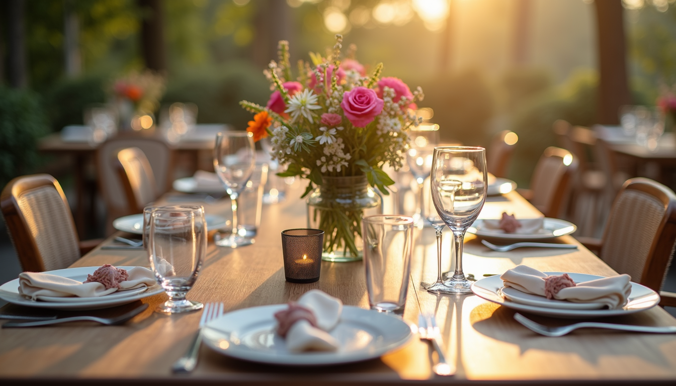 An elegantly arranged table setting showcasing vibrant flowers and artistic dishes.